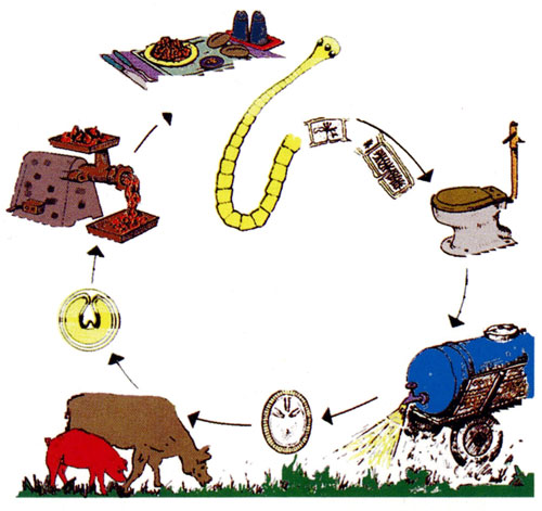 La fase adulta (Tenia) vive en el intestino del hombre, pone multitud de huevos que son eliminados al exterior con las heces, contaminando las aguas y los pastos donde se alimentan los animales. Al ingerir las vacas o los cerdos estos huevos desarrollan en su interior la larva o forma joven del parásito que queda alojada en sus músculos.